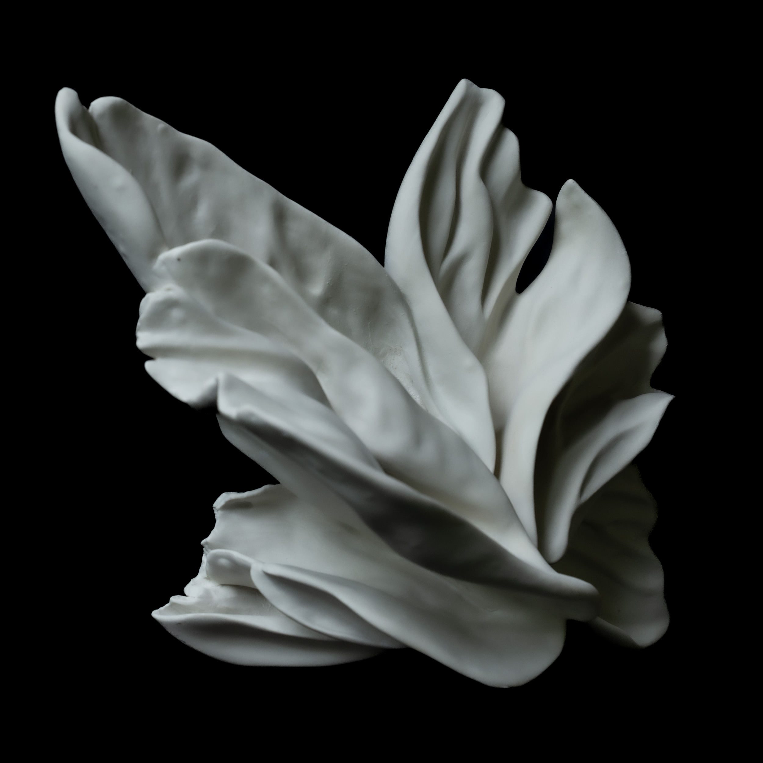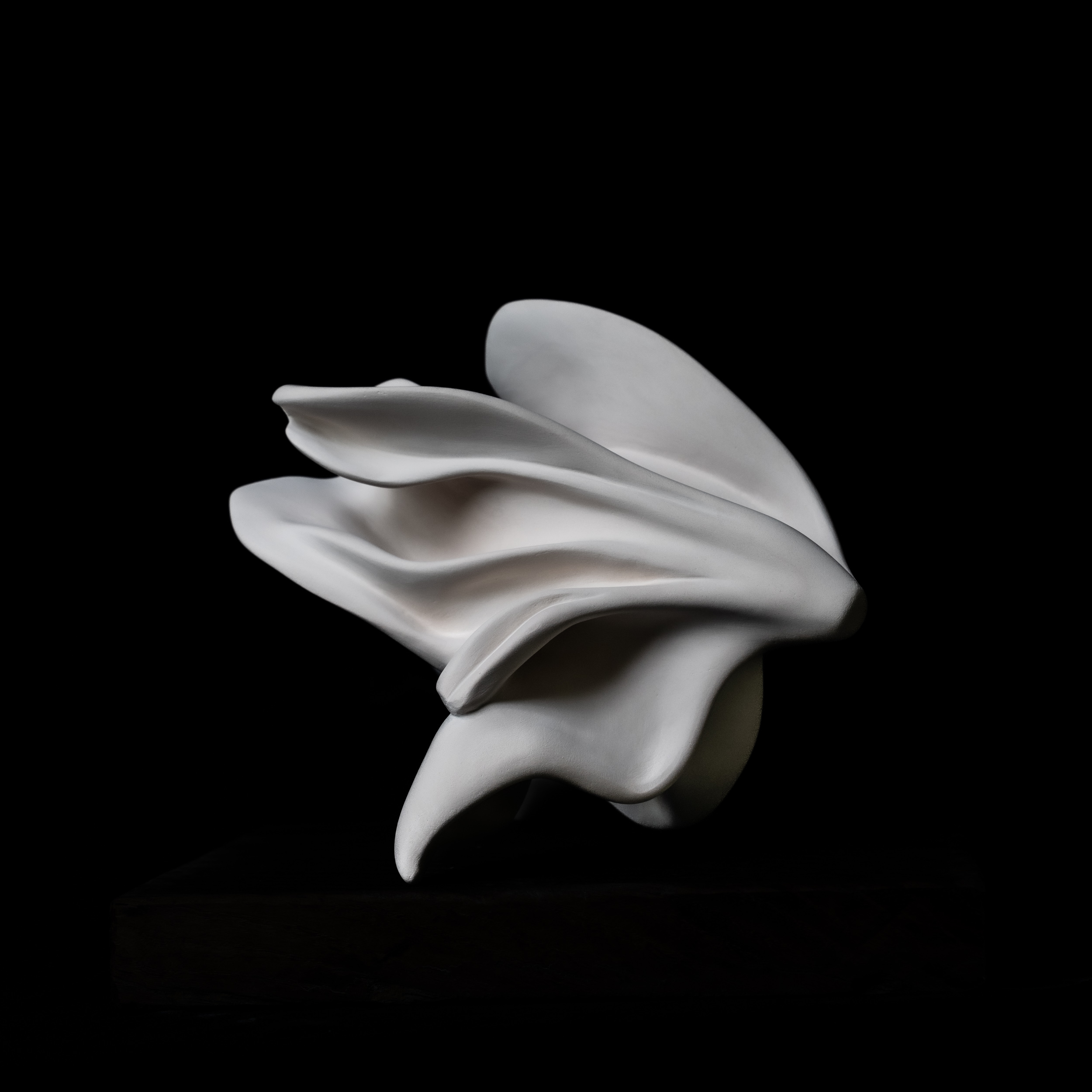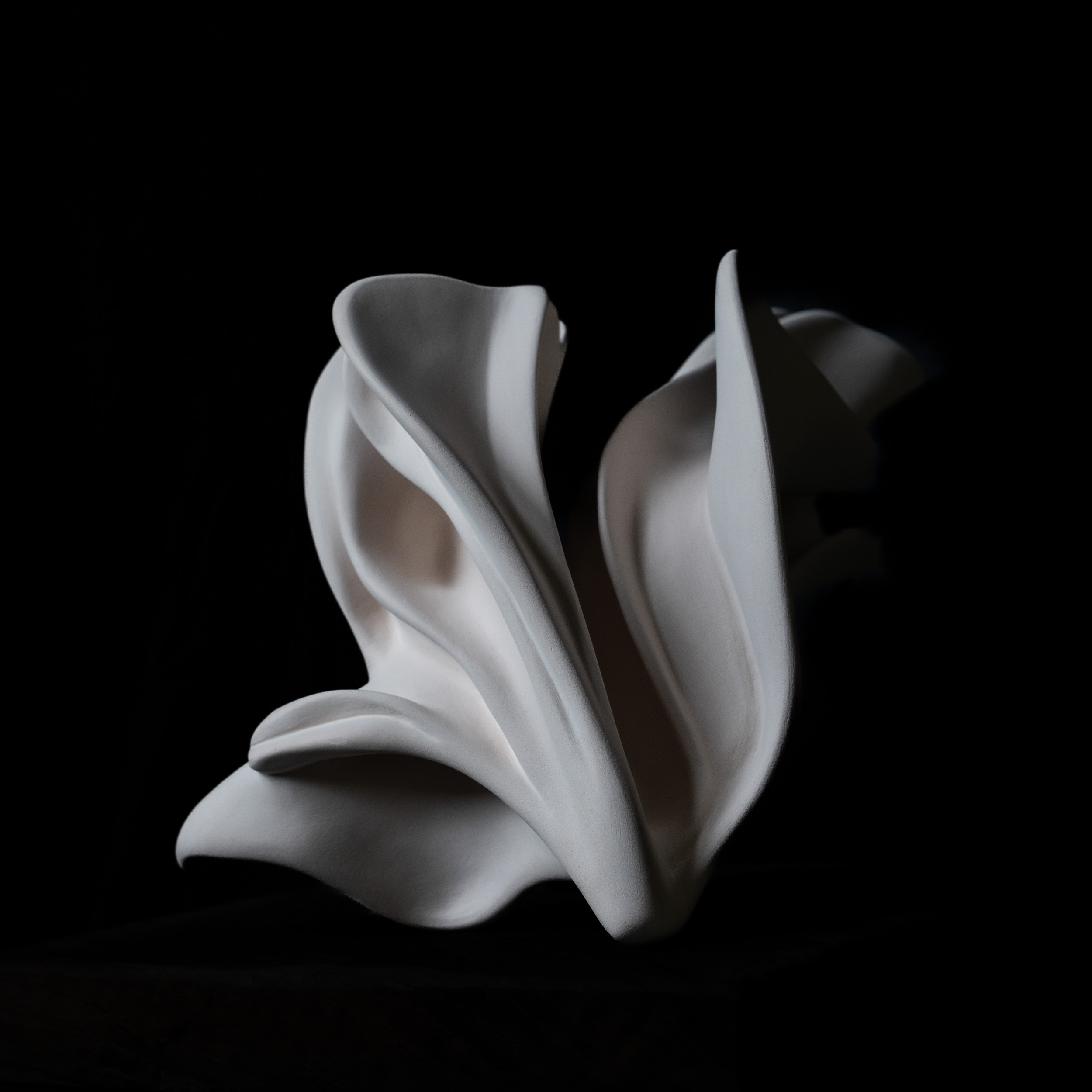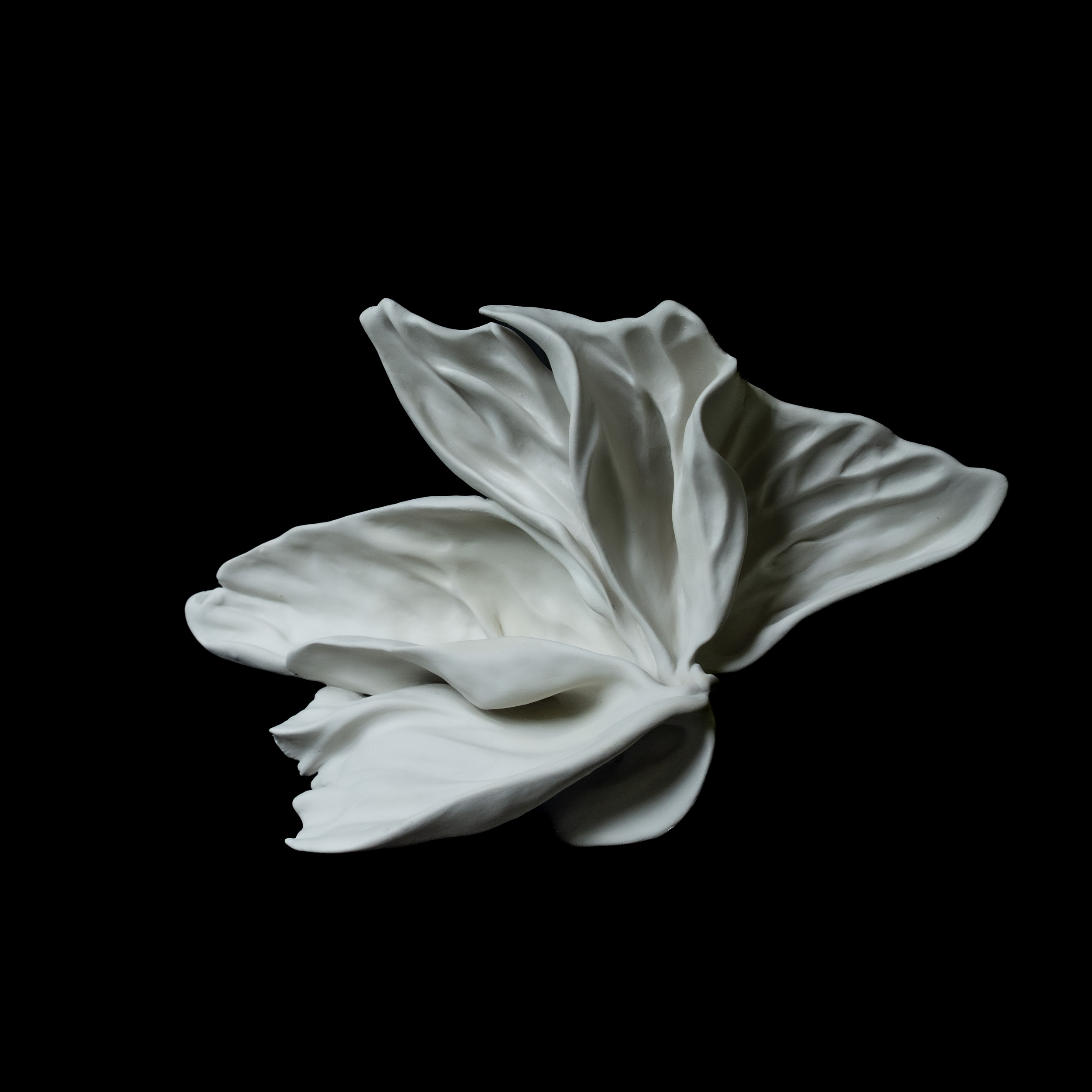 Working in Jingdezhen porcelain, Amy Thai extends her exploration of contrasting forces into a new material vocabulary. These floral forms, titled ‘Flux’ (流, Liú – meaning ‘flow’ in Chinese), can be displayed individually or as a pair, one lying horizontal while the other stands upright. The unglazed porcelain reveals the slightly grey colour of fired clay, its raw surface emphasising form and texture over sheen. Flux I relates directly to a work from the marble ‘Undercurrent’ series, translating the stone’s organic movement into porcelain’s delicate strength. Together, these pieces demonstrate how Thai’s artistic concerns – the tension between permanence and transformation, weight and lightness – remain consistent across radically different materials. Where marble speaks of geological time and glass captures light, porcelain brings its own tradition of fragility made durable through fire.