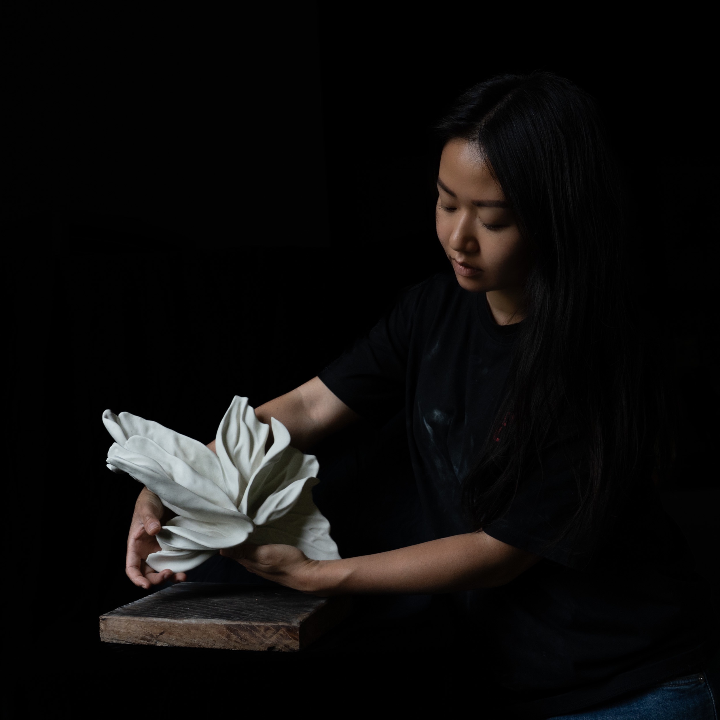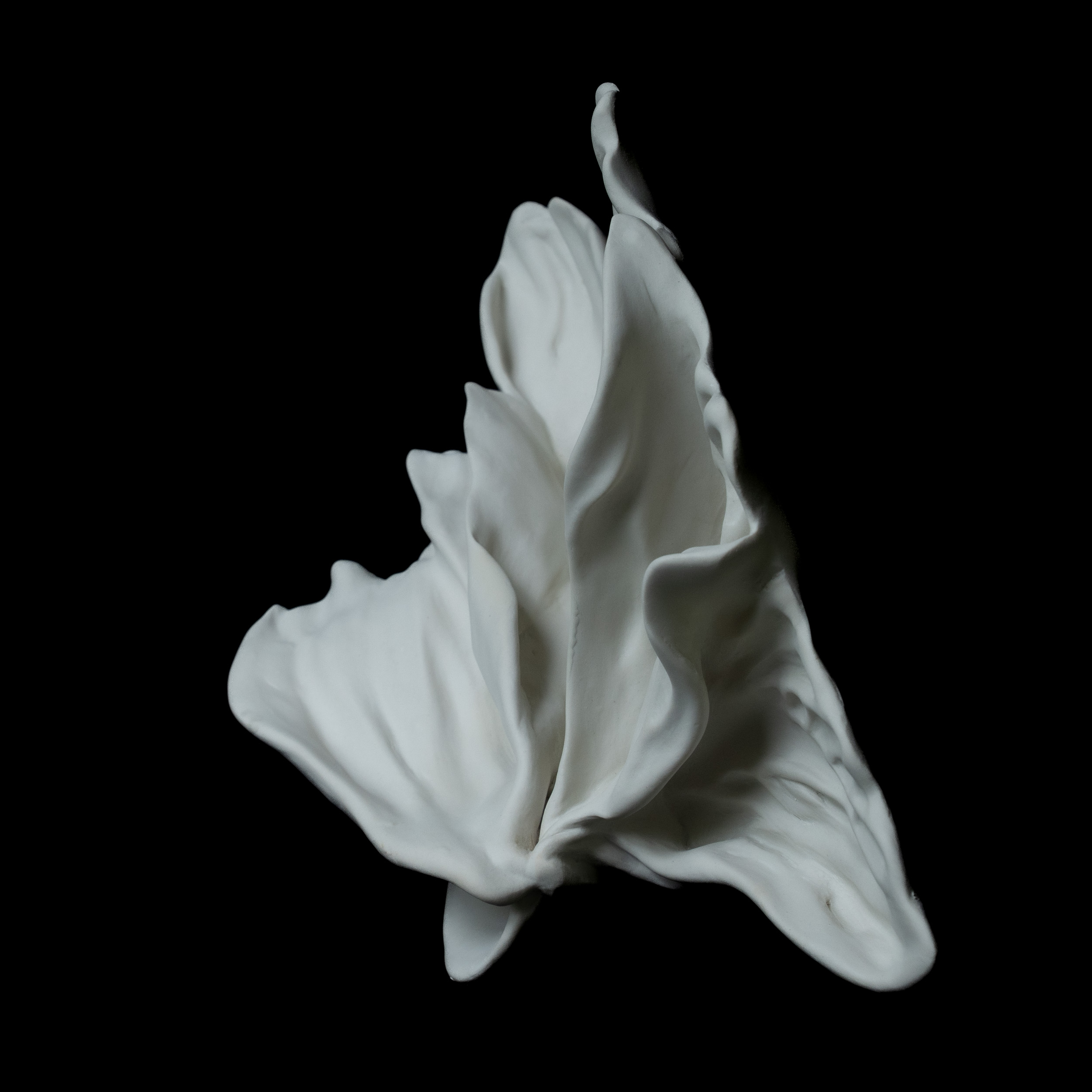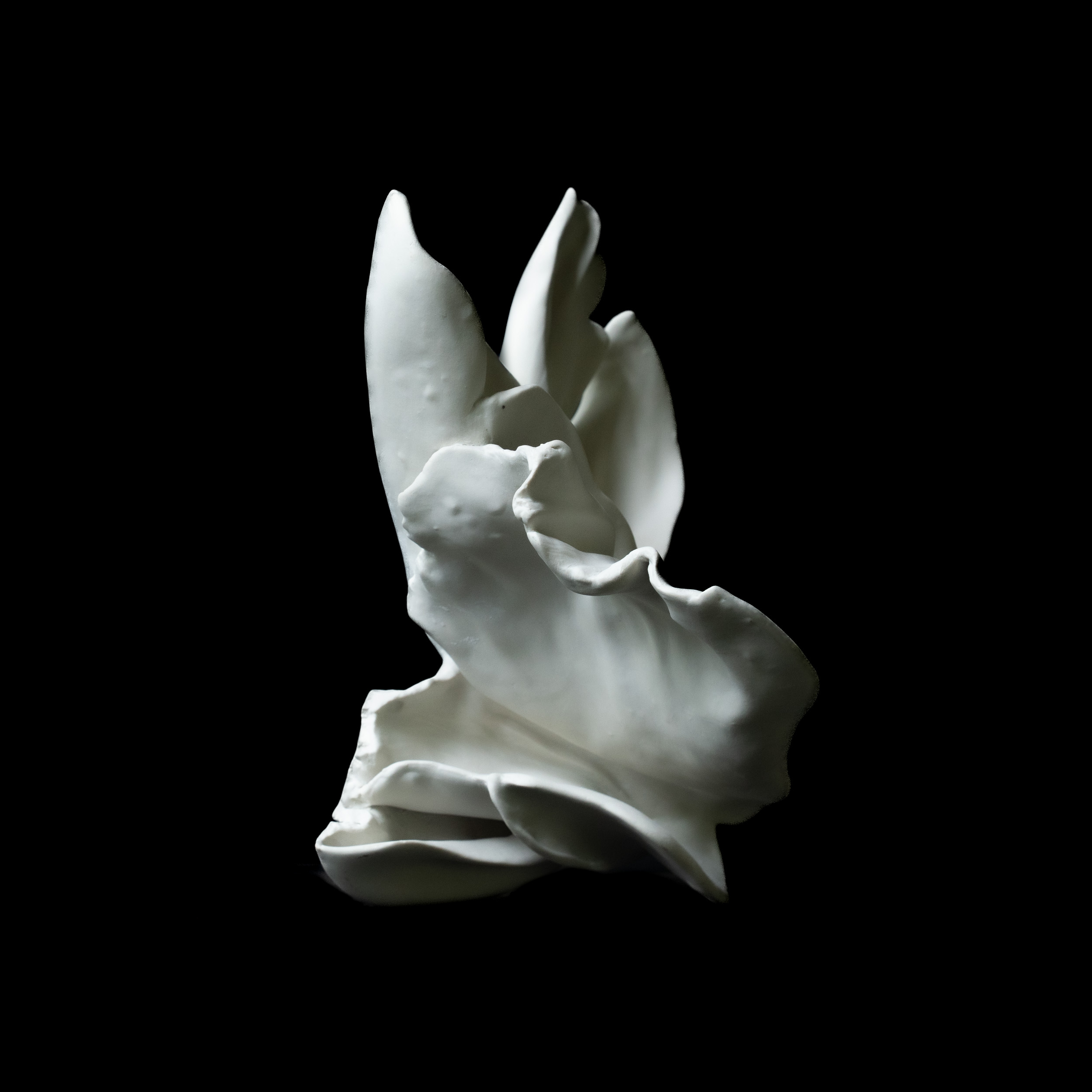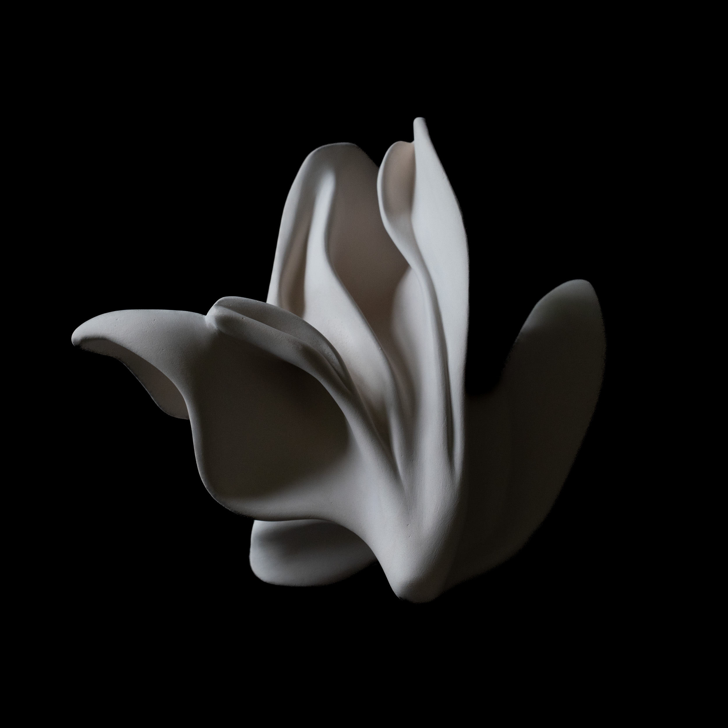 Working in Jingdezhen porcelain, Amy Thai extends her exploration of contrasting forces into a new material vocabulary. These floral forms, titled ‘Flux’ (流, Liú – meaning ‘flow’ in Chinese), can be displayed individually or as a pair, one lying horizontal while the other stands upright. The unglazed porcelain reveals the slightly grey colour of fired clay, its raw surface emphasising form and texture over sheen. Flux I relates directly to a work from the marble ‘Undercurrent’ series, translating the stone’s organic movement into porcelain’s delicate strength. Together, these pieces demonstrate how Thai’s artistic concerns – the tension between permanence and transformation, weight and lightness – remain consistent across radically different materials. Where marble speaks of geological time and glass captures light, porcelain brings its own tradition of fragility made durable through fire.