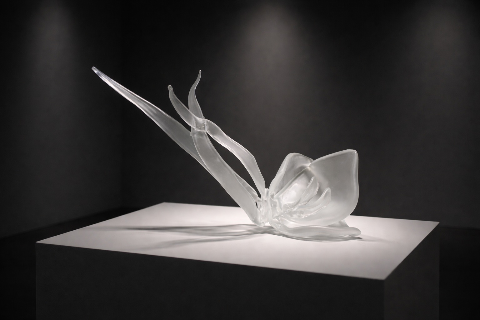 ‘Suspense’ captures the moment when an orchid's petals reach toward light, stretching into empty space with elegant urgency. The velvet-like surface of the transparent, slightly sandblasted glass embodies both the fragility and resilience of these botanical forms in their perpetual state of becoming. The title evokes multiple layers of suspension: the physical extension of the petals, the emotional weight of anticipation, and the fleeting instant between growth and stillness. Like the orchid that orients itself toward an unseen source, the sculpture explores themes of faith in the invisible – those times when we must venture into uncertainty, trusting in what we cannot yet see.