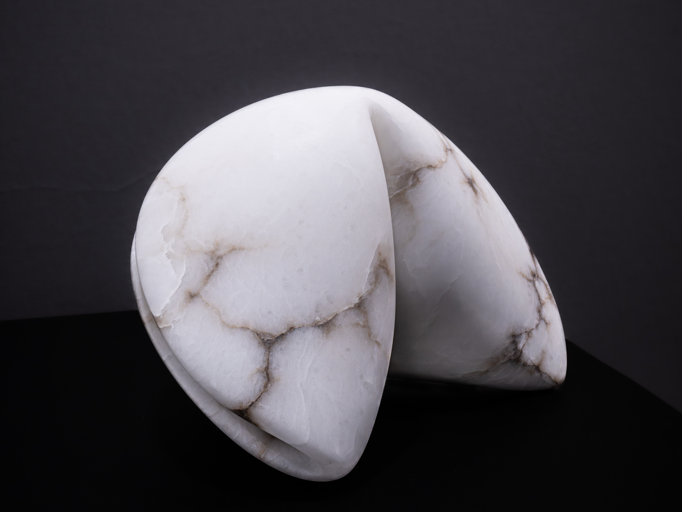 This elegant alabaster sculpture captures the sensuous, organic curves that hover between landscape and body, abstraction and intimacy – those ambiguous forms that resist singular interpretation while maintaining their quiet power. The smooth, veined stone emphasises the work’s corporeal quality, inviting viewers into a contemplative space where soft, flowing lines create a meditation on vulnerability and strength. Both the sinuous shapes and the title serve as a direct homage to Georgia O’Keeffe’s pioneering exploration of feminine form through abstraction. On a more personal level, the artist found unexpected comfort in a simple fortune cookie during a difficult period in New York, and this sculpture translates that fragile reassurance into lasting form.